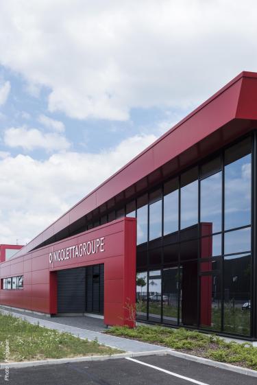 La parcelle située au bord de l’autoroute A31, la future construction devait se signaler par son volume, par sa couleur. Ces deux paramètres se retrouvent dans une grande équerre rouge s’étirant vers une de ses extrémités, donnant du dynamisme, du mouvement à la façade bordant l’autoroute. Sous cette équerre s’est glissé un volume de verre, accueillant les bureaux.