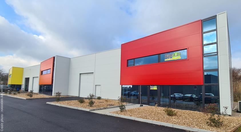 Afin d’identifier les cellules artisanales, trois volumes, de couleurs différentes, « flottant » sur du verre, rythme la façade principale.
