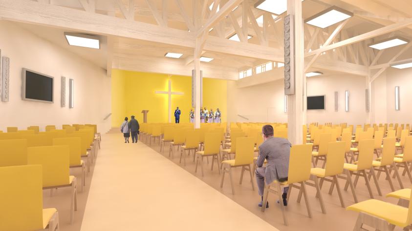 La volonté est de conserver l'aspect patrimonial du bâtiment et de son impact urbain. Il s'agit de mettre en valeur la construction industrielle du début du 20e siècle tout en l'harmonisant avec sa nouvelle fonction. L'étage permet de créer un signal urbain de lieu de Culte. Ainsi, l'impact urbain du bâtiment est conservé, mais permet une lecture de sa nouvelle fonction.