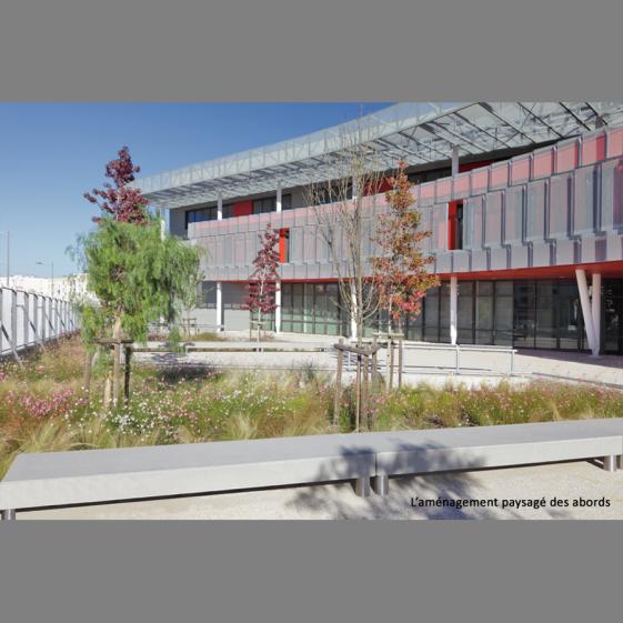 - une nappe horizontale triangulaire, l’ombrière métallique translucide, qui vient protéger du soleil à la fois le bâtiment et le parvis d’accès. Grâce à un majestueux portique métallique, elle vient aussi conforter l’axe central du lycée.
