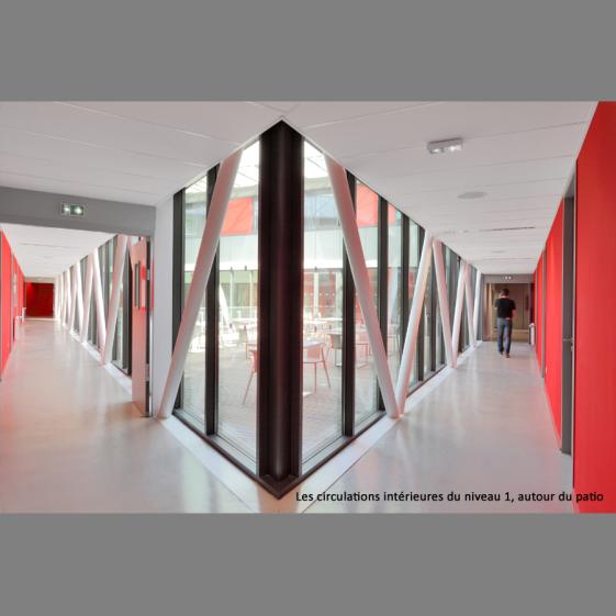 On trouve à rez-de-chaussée le hall d’entrée, la salle d’exposition et l’espace polyvalent, vitrés sur le parvis soigneusement paysagé, puis les locaux de la vie scolaire, côté cour.