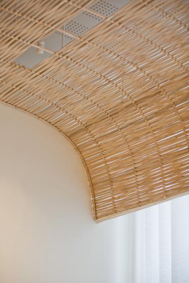dimension de la voute est conditionnée par la longueur des sections des bambous : 4m. La fibre est taillée et préparée en atelier. Le maillage est tressé, tramé ou plein selon s’il dialogue avec la lumière, l’autel, l’éclairage ou le vitrail. Le tissage est réalisé sur place par la main de l’homme.