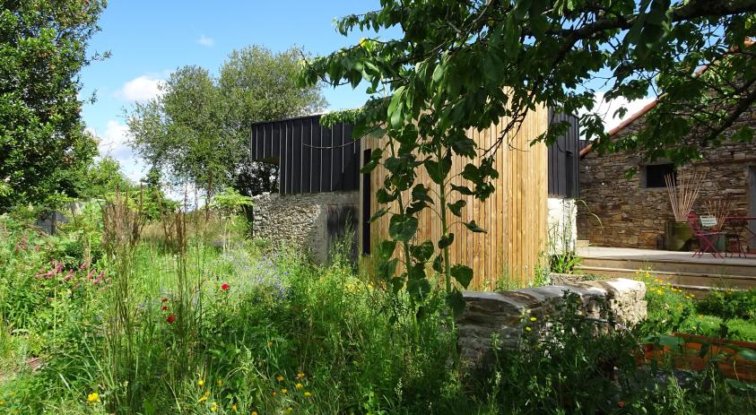 Les murs d’une ancienne grange en pierres ont été conservés et complétés d’une ossature bois recouverte en Zinc Anthra. Le projet semble sortir de la ruine.