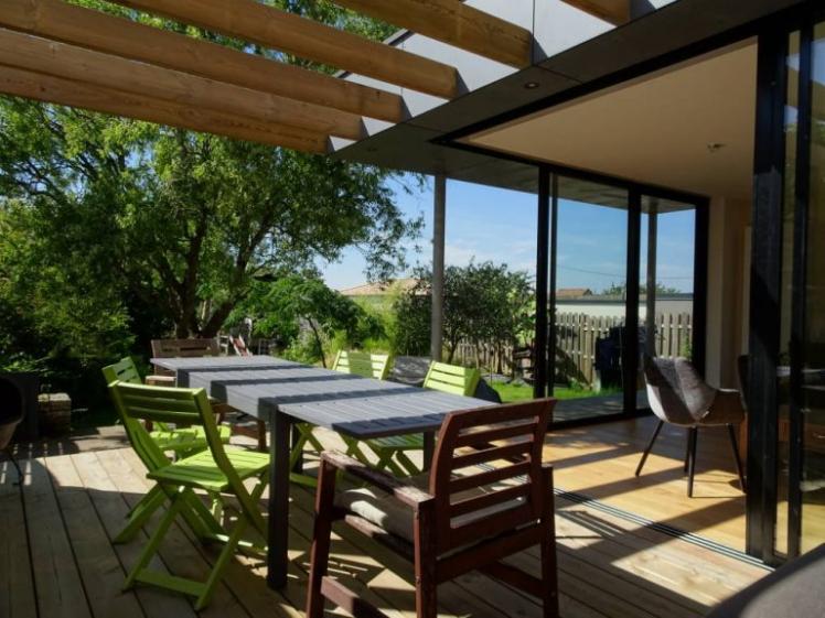 L’extension est réalisée de telle manière qu’elle offre une façade complémentaire au sud donnant sur une terrasse abritée et couverte d’une pergola. Les seuils et plafond sont en continuité entre l’intérieur et l’extérieur. Une fois la baie d’angle ouverte, la limite entre l’intérieur et l’extérieur disparaît au profit d’une terrasse dedans dehors.