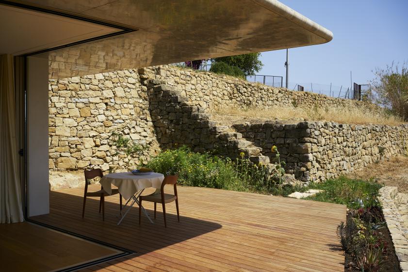 La maison, tout en courbes et de plain-pied, épouse la topographie du terrain en s’étirant sur une seule terrasse exposée au soleil couchant vers la mer. Son volume ne dépasse pas la hauteur de la terrasse qui l'accueille. Ici, point de coffre à stores en plastique pour se protéger du soleil mais une ombrière en béton brut en arrondi qui suit toute la façade chaude de la maison, abritant ainsi la terrasse conçue comme un prolongement du volume habité. Presque dessiné à la craie, le tracé de cette terrasse reproduit la silhouette de l’ombrière.