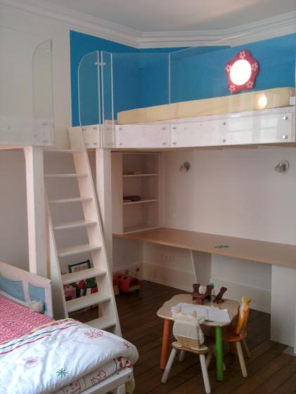 Durée des travaux : 5 moisSurface : 40 m²Coût : 15 700 € HTCréation d'un espace bureau entre deux chambres, paroi translucide, lits en mezzanine.