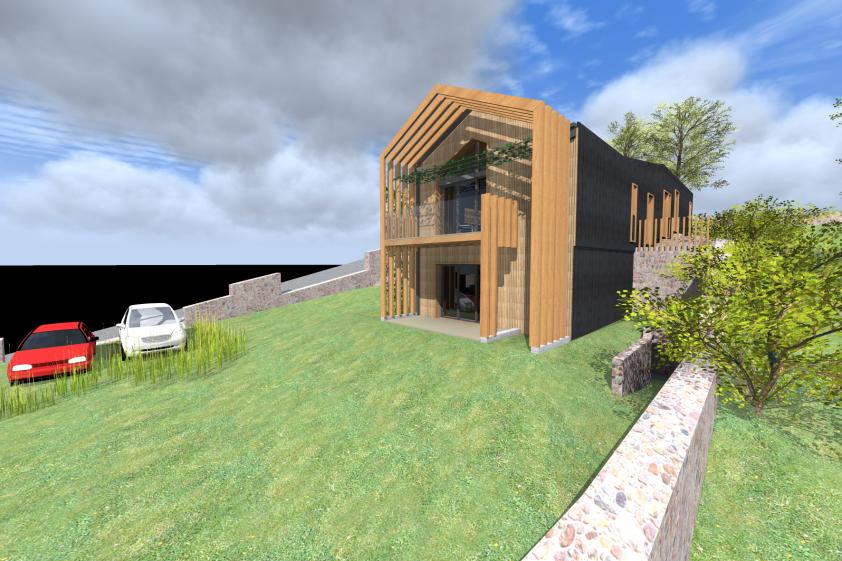 Le bâtiment a une écriture architecturale qui s’appuie sur des traces, et des éléments fondateurs existants. Nous tirerons parti de l’ensemble des murets (tant périphériques qu’en terrasse), de la topographie pentue du site, des arbres, de la tonne, de la porte d’accès à la parcelle…. La proposition se veut contemporaine mais encrée dans un territoire.