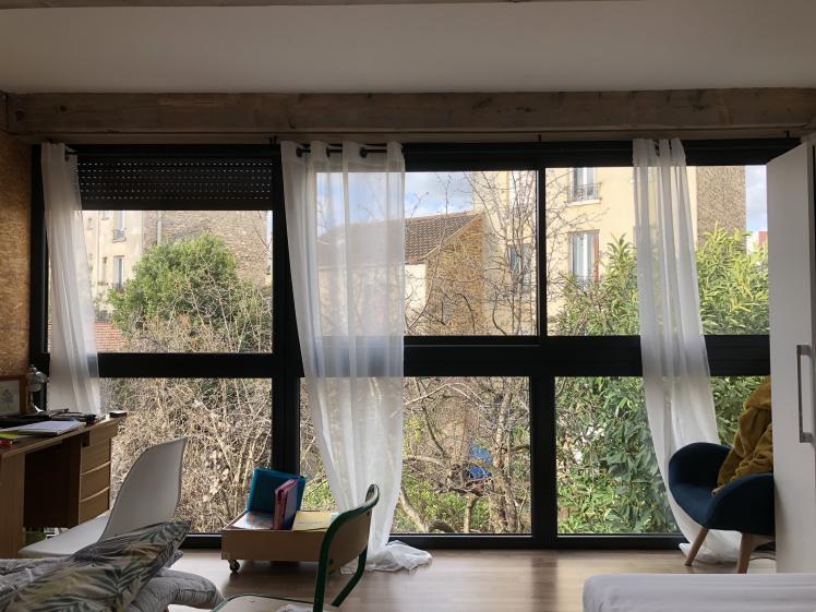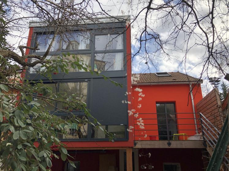 Côté rue, le toit fait place à une grande lucarne verrière en zinc, permettant d'agrandir les chambres. Coté jardin, l'ancienne façade de "bric et de broc" se métamorphose avec une extension largement vitrée sur toute la hauteur qui plongent le séjour et la nouvelle chambre dans le feuillage du grand arbre de ce petit jardin. La nouvelle construction est en structure bois, pour facilité de mise en oeuvre en chantier habité, isolée par l'extérieur avec de la fibre de bois, finition enduit. Ainsi, ce projet a permis de gagner en espace et confort, économie énergétique