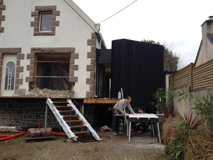 Mission de l'architecte : Complète.Extension en ossature bois sur dalle bois fondée sur pieux métalliques vissés.Utilisations de bois locaux non traités (ossature et bardages en douglas peinture noir de falun).Surface : 25.53 m².
