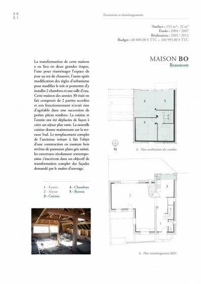 • Date de livraison : 2012• Ville : Beaumont• Département : 63• Maitre d'ouvrage : Privé• Architectes associés : Aucun• Coût : 175 000 € TTC• SHON : 153 m2 + 32 m2• Nature de la mission : Complète