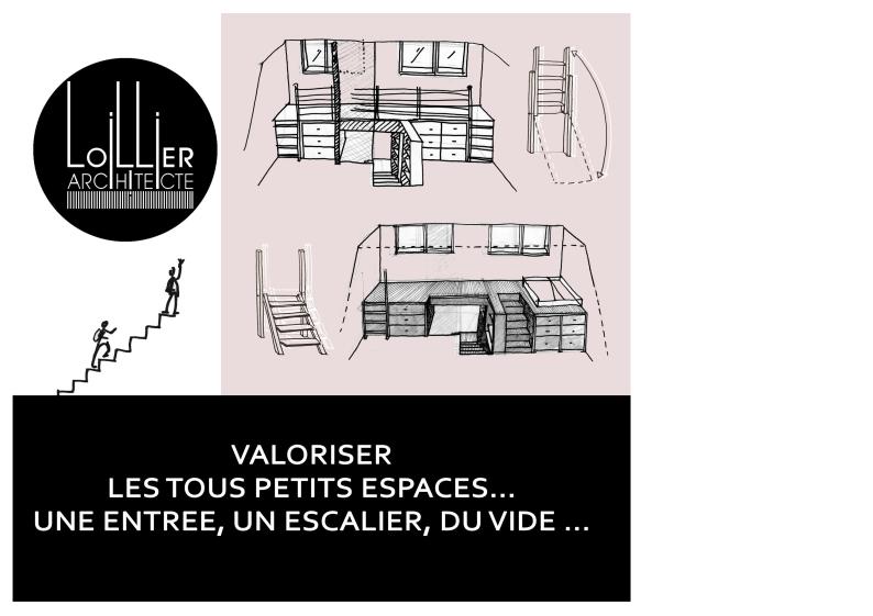 Il s'agit de traiter les espaces autour d'un escalier : rendre fonctionnel l'entrée (anciennement lieu fourre-tout) en rez-de-chaussée, et sécuriser le vide de l'escalier à l'étage. Le "balcon" intérieur permet aussi d'accéder en sécurité aux châssis vitrés disposés en hauteur. L'escalier existant est contenu dans les rangements qui servent de garde corps et lui donnent une fonction a part entière. Une transparence est laissée en bas par les trames des éléments bois et à l'étage par la pose de filets d'escalade qui laisseront une bonne luminosité. Le reste de la structure est traité en métal peint.