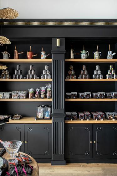 La devanture, les meubles, vitrines, et comptoirs créés sur mesure sont à la fois fonctionnels et décoratifs. Composés de colonnes, de moulures et de cannelures, ils sont sublimés par les luminaires et les objets chinés par le client. La niche décorative sur fond rouge est pensée comme la vitrine d’un musée permettant d’exposer des peintures et objets liés à l’histoire du chocolat.