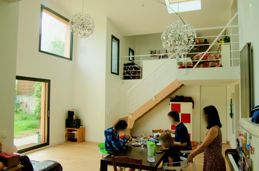 L'extension permet de relier les niveaux de vie de la maison existante situé à l'étage avec le jardin au Nord. Le séjour et la cuisine descendent au jardin alors que le séjour devient une chambre et un bureau. L'extension en ossature bois et couverte par une toiture en zinc dont les pentes s'ajustent en intégrant ou évitant les fenêtres de la maison existante. En résulte un espace intérieur défini par les pentes de toit pliée comme un origami. Les baies vers le jardin sont conçues comme des tableaux cadrant les arbres du jardin.