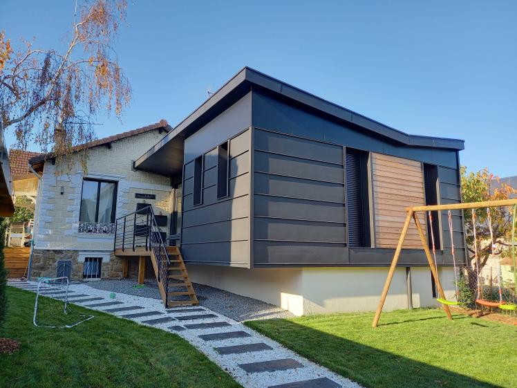 Coté jardin, le zinc noir et les plaques noires se retourneront jusqu'à la grande baie du séjour assurant la jonction avec la maison existante. Et derrière la maison, la salle de bains sera habillée également en zinc noir.