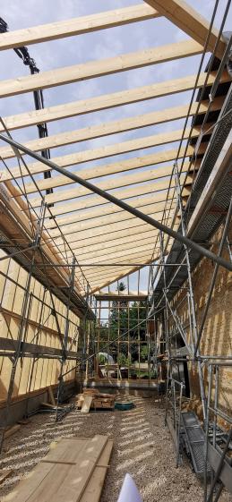 Réaménagement complet et extension d'une cuverie. Matériaux biosoursés: murs ossature bois, remplissage béton de chanvre projeté.