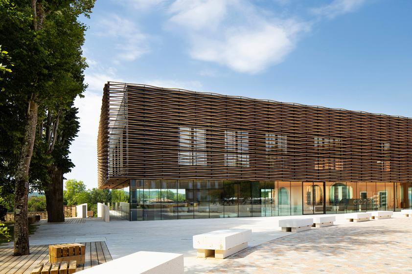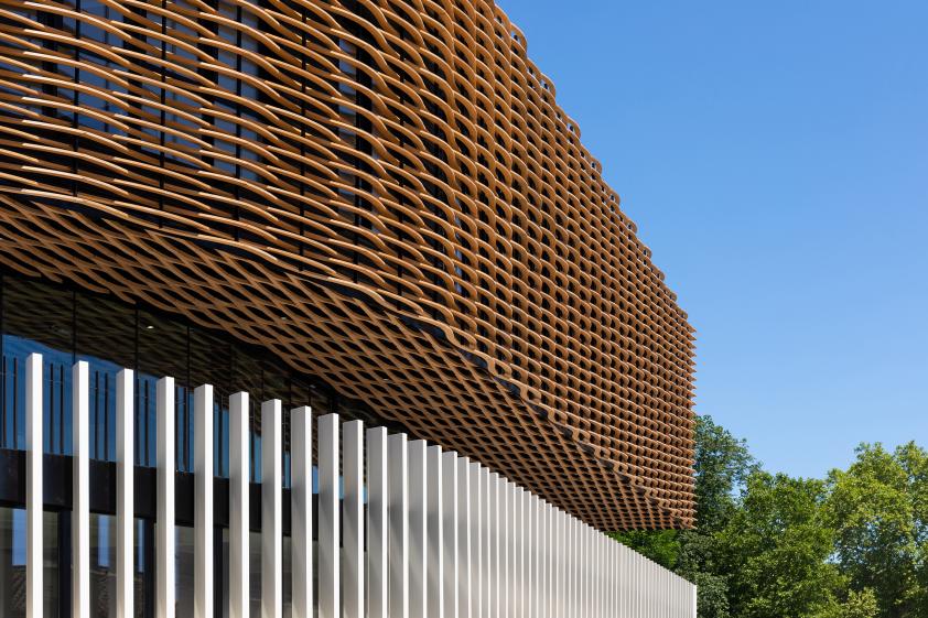 Le bâtiment d’extension, qui se développe sur 4 niveaux du R-2 au R+1, se compose en strates horizontales traitées par l’association de trois matériaux de façades principaux: le béton blanc, le verre et le bois.
