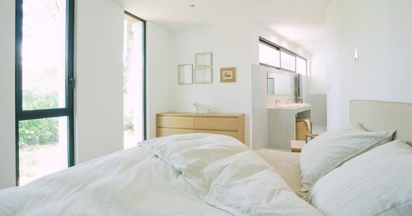 L’architecture de cette maison résolument contemporaine privilégie des liens intimes avec le site. Les espaces intérieurs sont traités avec le même esprit fusionnel avec la nature environnante. Le positionnement précis des percements offre aux occupants des cadrages particuliers sur les espaces naturels et fonctionnent comme des tableaux évoluant au fil des saisons.