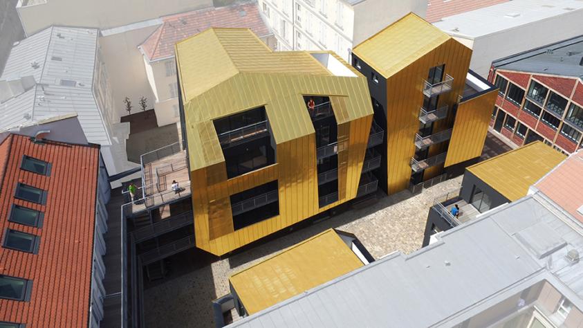Les bâtiments neufs sont adossés scrupuleusement aux héberges mitoyennes à l’exception d’une partie du bâtiment central, pivot qui se retourne sur la cour voisine. Les toitures ont un lien de parenté à la fois formelle et technique avec les toitures voisines. Le matériau « cuivre gold » (alliage de cuivre et d’aluminium) en version pleine et perforée ainsi que les grandes tropéziennes inscrivent ces nouveaux bâtiments dans leur époque. Les couvertures en cuivre gold sont libres de tout édicule donnant une drôle impression de maquette : toute la ventilation du projet est enterrée et les panneaux photovoltaïques et les panneaux solaires sont installés sur les toitures des bâtiments réhabilités. La pose de la couverture à joints debout reprend la pose traditionnelle du zinc parisien.