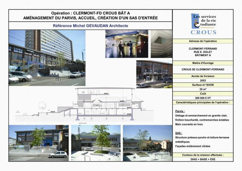 • Date de livraison : 2003• Ville : CLERMONT-FERRAND• Département : 63• Maitre d'ouvrage : CROUS• Coût : 300 000 €• SHON : 30m²• Nature de la mission : DIAG + BASE + EXE