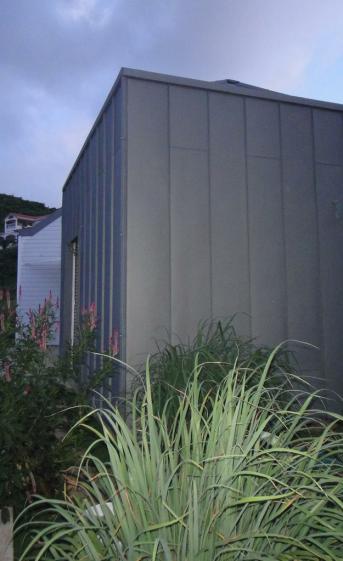 La villa Archi s’ouvre sur la vallée de Colombier (le poumon vert de Saint martin). Les volumes utilisés sont des volumes traditionnels de l’architecture vernaculaire, le « deux pans » sans débord de toiture pour le volume des chambres et le « quatre pans » pour le salon, reliés avec une toiture plate abritant salle de bain et cuisine.
