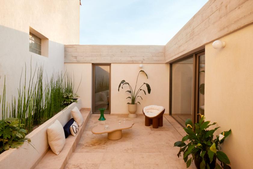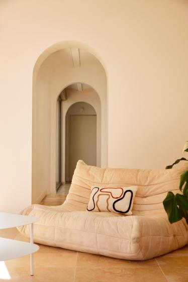 D’un corps de bâtiment existant découpé en S, le projet s’étend jusqu’à la parcelle mitoyenne pour qualifier un patio. Le sol continu ponctué d’un emmarchement souligne une transition douce, mais affirmé vers le nouveau programme. La courbe des passages intérieurs se dégrade en plafond avec l’utilisation de voûtains en brique atténué par une peinture blanche. Articulation de l’existant et du projet, le bureau se parcourt dans ses deux axes et une percée visuelle du patio au jardin s’apprécie par deux grandes baies fixes.