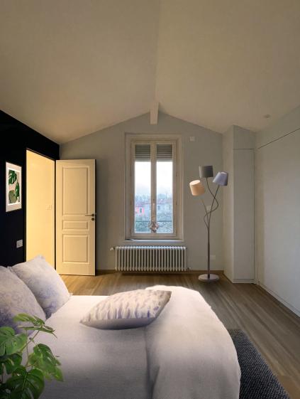 Restructuration de deux appartements en une maison unique, avec créations des chambres et salles de bain, des escaliers reliants les niveaux, et agrandissement et rénovation du séjour.