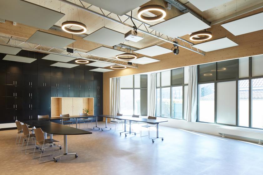 Situé au cœur la ville de Maromme, l’EHPAD des Aubépins est situé à proximité de la paroisse communale et de l’espace culturel Beaumarchais. Le projet consiste en l’extension de l’actuelle mai-son de retraite pour y intégrer un programme de salle polyvalente. Doté d’un podium et d’un espace de 137 m² pouvant accueillir 102 places assises, cette salle est destinée à accueillir et à rassembler les résidents pour différents événements (conférences, expositions...). Cette extension poursuit le développé de la façade du rez-de-chaussée actuel pour se retourner vers le jardin. Par le travail de la coupe, la construction ne bloque pas la vue des résidents logeant au premier étage ainsi le volume vêtu de bois s’intègre à son environnement et se fait discret dans le jardin.