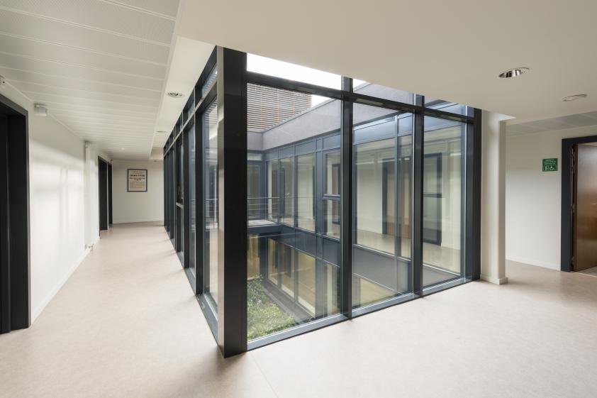 Le projet consiste au réaménagement intérieur d’une partie du Rez-de-Chaussée du bâtiment de la « Commanderie Saint-Jean » abritant les locaux de l’Ecole Nationale d’Administration à Strasbourg. En parallèle, une extension est implantée à l’ouest du bâtiment historique et reliée à celui-ci grâce à une passerelle au premier niveau. Les quatre façades du bâtiment d’extension de l’ENA emploient un vocabulaire architectural commun, réinterprété selon l’orientation des façades et leurs vis-à-vis. Elles sont principalement en mur à ossature bois, à l’exception des cages d’escalier et du rez-de-chaussée qui sont réalisées en béton, plus résistant aux dégradations et à l’accrochage des structures du mur végétal. Ce procédé permet d’avoir une façade libre, indépendante de la structure. Le bâtiment possède une volumétrie simple, qui vient dynamiser les volumes de l’amphithéâtre et de la passerelle de liaison avec le bâtiment existant. Des panneaux photovoltaïques sont implantés entre les vitrages de la façade Sud, créant ainsi un jeu entre surface opaque, transparente et réfléchissante.