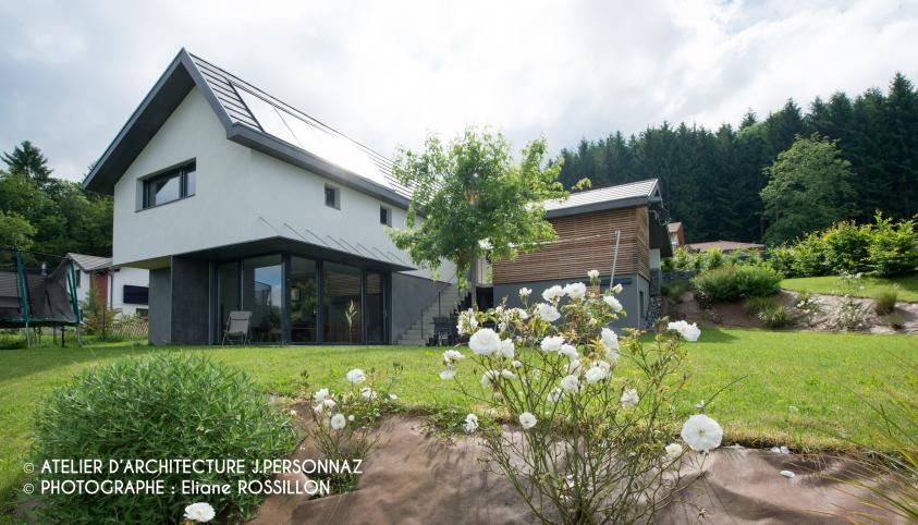 La maison s’implante habilement dans la pente pour une parfaite intégration. Desservie en amont, la maison se veut discrète depuis la route.