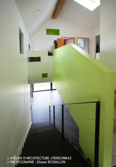 Tout est en subtilité, la séquence d’arrivée est traitée comme une découverte sur le paysage lointain. La faille-escalier entre l’abri voiture et le volume de la maison permet une découverte du Vercors majestueux et du jardin juste avant de rentrer à l’intérieur.