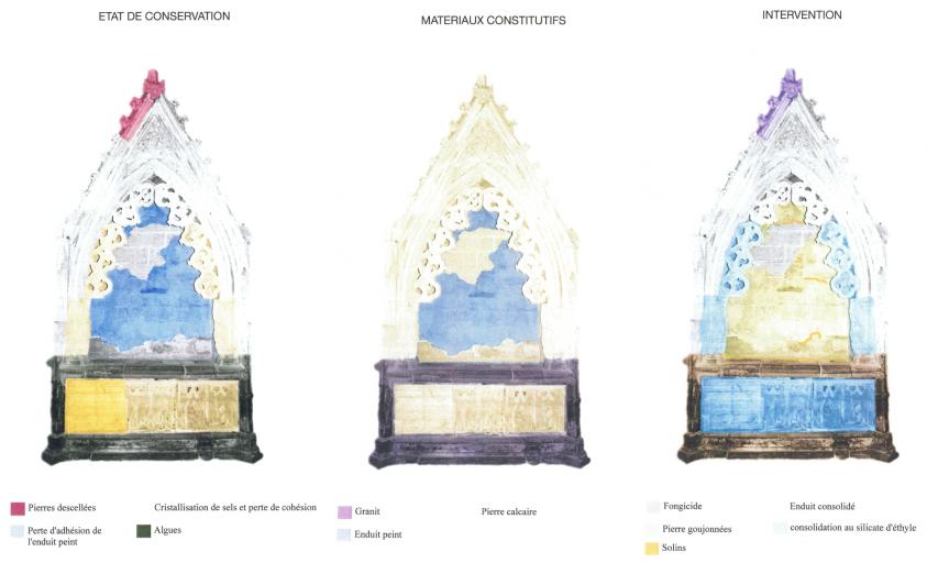 L’ensemble des parties en calcaire a été dessalé après consolidation. Une coque en plomb a été mise en place pour isoler les panneaux calcaires de la base en granit.