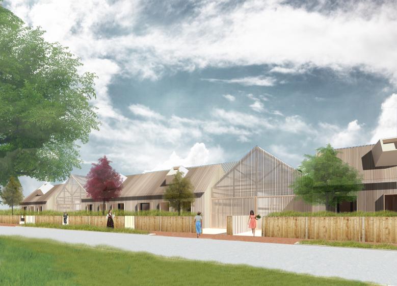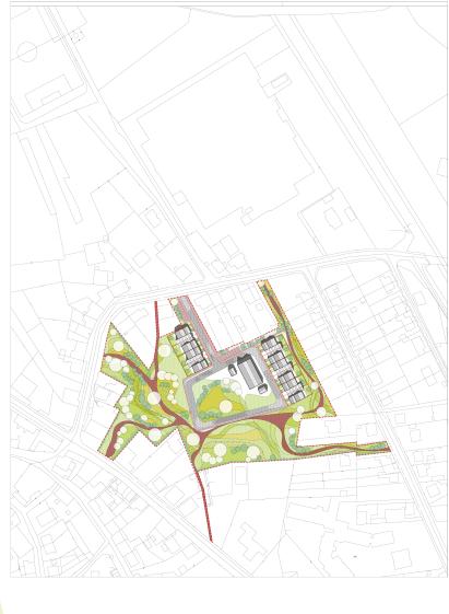 Le plan masse paysager en accord avec l’OAP, mettant en scène les paysages vosgiens est inspiré des tracés des méandres de la Moselle entre Nomexy et Bainville-aux-Miroirs, en mettant en oeuvre des strates paysagères d’essences locales, aux hauteurs, densités et couleurs différentes. En annexant au projet les parcelles 340, 153 et 154, nous créons ainsi une promenade circulaire en grès rose des Vosges, accessible aux riverains depuis les rues de l’Estrey, rue Jeanne d’Arc et rue de Lorraine et en reconnectant ainsi directement ces rues. L’implantation et la conception des logements se veut flexible et modulable afin d’optimiser le foncier à un instant T et dans le futur. Chaque logement est constitué de trois modules en structure bois. La mitoyenneté a été rompue en volumétrie en concevant des ensembles de jardins d’hiver qui permettront de générer une transparence entre la rue et le fond de parcelle et ramenant un maximum de lumière dans les logements à n’importe quel moment de la journée.
