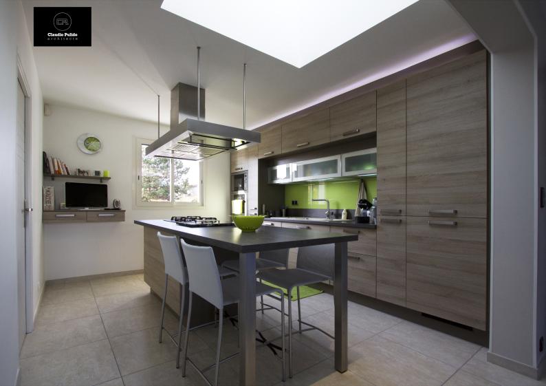 L’un qui ponctue la ligne de la poutre du plafond et invite le regard à s’attarder au niveau de la terrasse et du jardin. La table familiale, placée sous ce caisson s’impose comme liaison entre le salon et de la cuisine qui est ouverte, spacieuse, claire est résolument contemporaine.