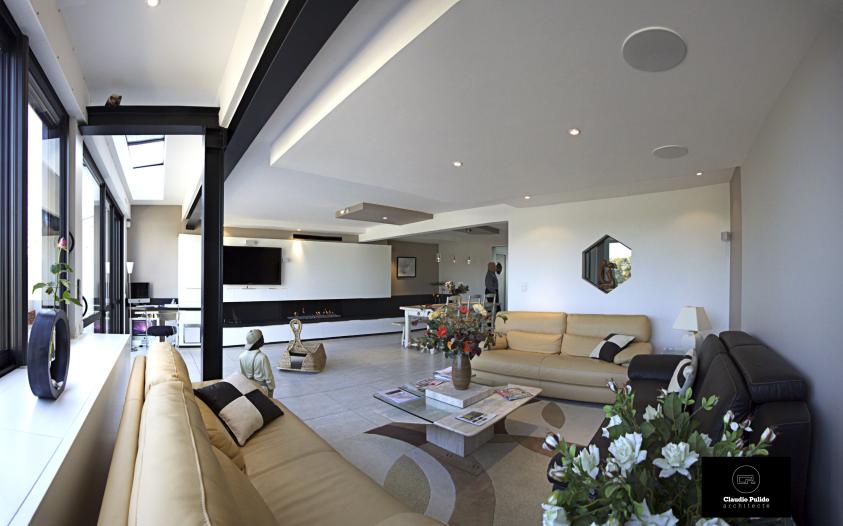 La présence d’une structure, charpente métallique noire, perpendiculaire au meuble cheminé faisant plus de 7 m de long, intégrant des rangements, le téléviseur ainsi qu’un espace bureau en son extrémité sur la façade jardin, ne peut interpeller le visiteur.