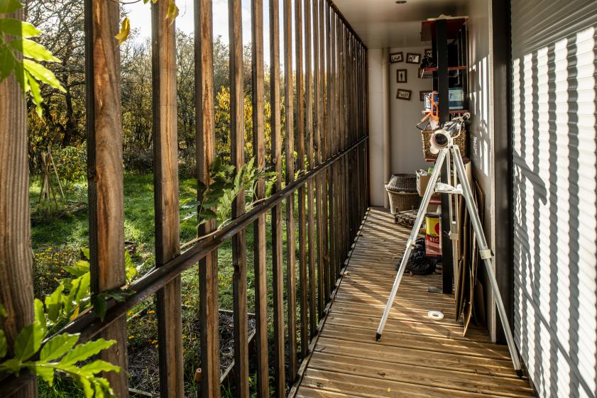 La maison s'attache à préserver le charme originel du terrain qui l'accueille. Celui-ci, présentant une faible pente vers l'ouest, se caractérisait par une franche dichotomie entre partie est, très boisée, jonchée d'émergences rocheuses et la partie ouest plus sereine. La première partie, caractéristique des paysages du causse lotois, lieu adéquat à la flânerie a été conservée. La maison s'implante sur la partie la moins accidentée et la moins arborée à l'ouest. Tournant le dos à l'entrée du lotissement au nord, la maison s'ouvre au sud, et délimite un espace dialoguant avec un mur de pierre qui clôt le terrain. Le projet, un long rectangle extrudé de faible hauteur laisse visible la forêt qui orne le fond du lotissement, très opaque au nord et à l'ouest, il se protège des intempéries. La façade sud profite au maximum des apports solaires. Le volume de la bâtisse posé sur le sol à l'est, s'élance vers l'ouest et se détache de la pente par des pilots qui permettent d'intimiser la partie chambre des vues directes pouvant émaner des chemins pédestres qui bordent le terrain en limite est et sud. Une terrasse longe les chambres, offrant la possibilité de s'ouvrir vers l'extérieur sans vis à vis. Tous les arbres ont été conservés. Le terrain, grâce aux pilotis n'a pratiquement pas été décaissé, ni remblayé. Les murets de pierre existants ont été conservés.