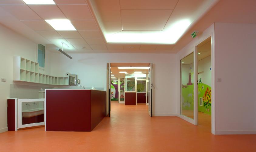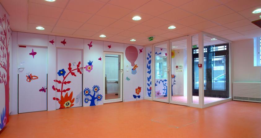 Les locaux à aménager dans la Mairie du 10e arrondissement se trouvent à l’angle de deux rues au rez-de-chaussée du bâtiment. Le programme de l’opération comprend la réalisation d’une halte-garderie de 30 places sur une surface de 410 m². Dans le projet il faudra faire profiter largement les pièces principales accueillant les enfants de la lumière naturelle du sud-est, rentrant par les fenêtres de la rue Pierre Bullet grâce à la faible hauteur des immeubles du côté nord de la rue. Toutes les pièces fonctionnelles et de services ne nécessitant pas d’éclairage naturel sont regroupées dans les parties peu éclairées au fond des locaux. Une cloison épaisse constitue l’élément ludique de la halte garderie. C’est un écran entre la zone des locaux fonctionnels et celle des locaux accessible aux enfants qui traverse toute la halte-garderie. Cet écran est habillé par une image murale. Réalisé par une graphiste, elle fait référence à la nature en remplacement de l’espace extérieur manquant dans le projet.