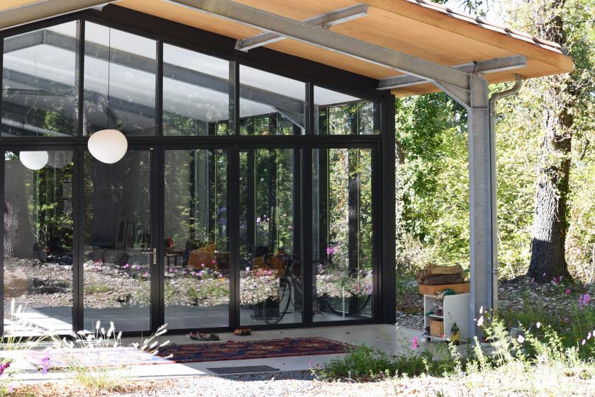 Un moulin à vent au milieu d’une clairière a été le point de départ de ce projet. Le moulin devait être conservé. Nous avons donc fait le choix d’adosser une construction rigoureusement contemporaine à cette tour en pierre. Les façades vitrées créent une transparence presque totale et permettent de fondre les frontières entre l'intérieur et l'extérieur. Nous avons utilisé des matières brutes telles que le béton, l'acier et le bois pour l’aménagement intérieur. Les espaces de vie sont regroupés autour d’un bloc technique central. La salle de séjour se transforme en une terrasse couverte où la façade vitrée peut être complètement ouverte.
