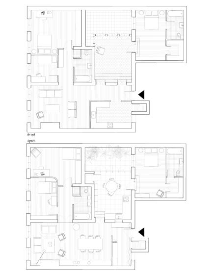 L’appartement est situé au premier étage d’un immeuble ancien au cœur du quartier du Marais. La nouvelle cuisine est placée sous une nouvelle verrière en acier. La cuisine et la verrière sont lumineuses et légères, contrastant avec le reste de l’appartement qui lui, est ancré dans l’ancien. En perçant et en créant des vues entre les deux parties nous avons accentué le côté labyrinthique de l’appartement. L’ensemble des pièces est revisité et reproportionné afin d’amener un maximum de confort et de générosité dans l’usage de tous les jours.