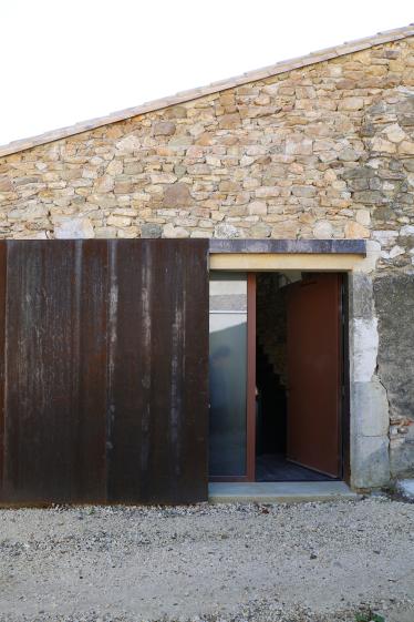 Par plaques géométriques l’acier tranche sur ces surfaces inégales. Il marque les ouvertures de l’étage avec une horizontale de corten brun qui tel un belvédère surveille le territoire. L’acier brut à l’intérieur habille des parois ou les plis de l’escalier soulignant la présence minérale. La cheminée suspendue s’étire sans fin vers le plafond.
