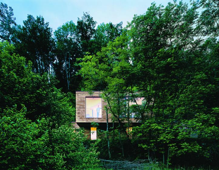 De nuit, les chambres et l’atelier étant peints chacun d’une couleur différente et les espaces communs laissés blancs, la maison apparaît telle une lanterne magique.