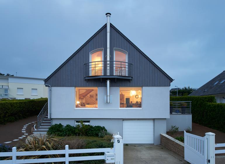 Rénovation lourde d'une habitation des années 70 sur la commune de Donville Les Bains : réaménagement complet du rez-de-chaussée et d'une partie du sous-sol, création d'un étage avec modification du volume de toiture. L'ensemble des pièces de cette habitation a été réaménagée et déplacé pour coller au mieux aux contraintes et aux atouts du site et notamment à la magnifique vue de mer au Nord. Les pièces de vie et la cuisine ont été déplacées, une terrasse a été créée à l'Ouest, ainsi qu'un balcon à l'étage.