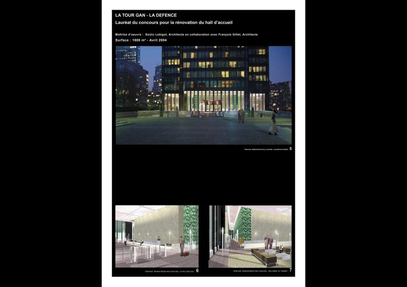 Lauréat du concours pour la rénovation du hall d’accueil de la tour GAN.Etude et réalisation des pièces graphiques pour la présentation du concours.