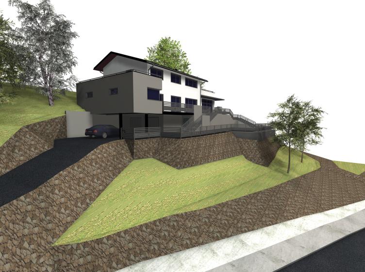 Le projet s'articule entre une volonté d'inscription dans une topographie difficile et des orientations architecturales permettant une organisation adaptée au programme et l'aspect contemporain de la maison. Pour ce faire, nous avons pris le parti de travailler sur une volumétrie simple avec une différenciation des différents éléments volumétriques qui la compose.