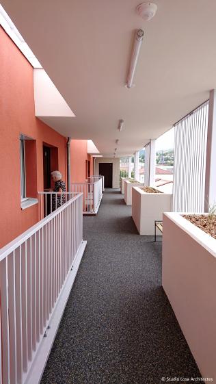 La façade Nord recueille les coursives, agrémentées de brises vue et de jardinières, permettant une distribution aérée et un lieu de rencontre pour les locataires. Les typologies d’appartements sont à la fois simples et fonctionnelles permettant, selon le cas, de vivre seul, en couple ou avec une personne aidante, tout en favorisant l’ autonomie de chacun. La quasi-totalité des appartements bénéficient d’un balcon et d’une double orientation, favorisant la ventilation naturelle.