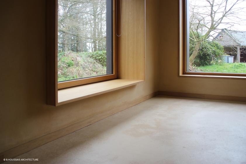 CONSTRUCTION/MATERIAUX : Maison en ossature bois et isolation paille en murs. Enduits terre dans les chambres. Bardage bois extérieur. Menuiseries extérieures bois-aluminium. Brise soleil extérieur en façade Sud. Complexe de sol : dalle chaux, isolant liège, chape terre (avec plancher chauffant). Plancher bois à l’étage. Isolation des rampants en ouate de cellulose insufflée en caissons, parement en plaques de contreplaqué bouleau. Aménagements intérieurs en bois : placards, commodes, banc, lits, embrasures des fenêtres. Chauffage par pompe à chaleur alimentant le plancher chauffant existant et celui de l’extension.