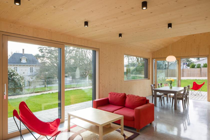 Le parti architectural met en valeurs les caractéristiques du mode constructif: la dalle de béton quartzé du RdC, les panneaux de bois massif contre-collé (CLT) et le réseau de VMC en acier galvanisés sont laissés apparents.