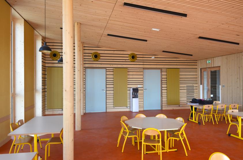 A l’intérieur de la salle à manger, le plafond se soulève vers l’Ouest, ses deux façades non parallèles s’écartent en allant vers le pignon Sud, lui-même entièrement vitré, et prolongé en toiture et au sol par une casquette et un balcon. Singulier, cet espace s’ouvre sur le paysage lointain au Sud et à l’Ouest, dans la perspective ouverte par la Rue des Ecoles. Les parois sont en enduit terre ou habillées de lames de bois ajourées, et participent au confort hygrothermique et acoustique. Le plafond est lui aussi traité en lames de bois ajourées, de teinte claire, et le sol est recouvert d’un linoléum coloré. L’ambition, avec le recours aux matières bois et terre, est de créer une ambiance apaisante pour une véritable pause dans la journée des enfants.