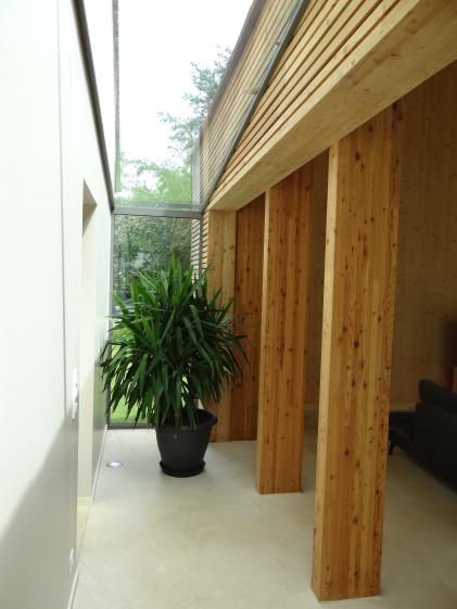 Extension d'une maison d'habitation en ossature bois KLH et lamellé collé. Isolation extérieure en fibres de bois, bardage en mélèze de Sibérie.
