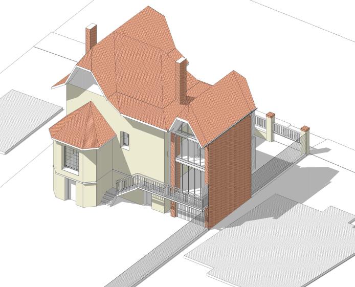 Extension R+2 de meulière en bord de Marne. Le pavillon existant est flanqué, latéralement, d'un édifice étroit, vertical, vitrée sur la Marne et sur le jardin, et recouvert d'un toit aux fortes pentes en tuiles, inspiré du style néo-normand de la maison.