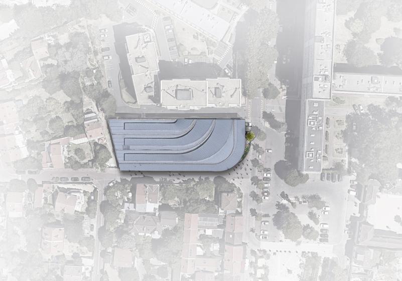 A l’angle, à l’entrée du bâtiment, ce plafond bois accompagne la façade courbe du marché et se soulève pour former une grande marquise et un auvent, afin d’accueillir naturellement la clientèle et l’inviter à entrer, à l’instar de bâtiments commerciaux emblématiques auquel la halle fait ici directement référence.